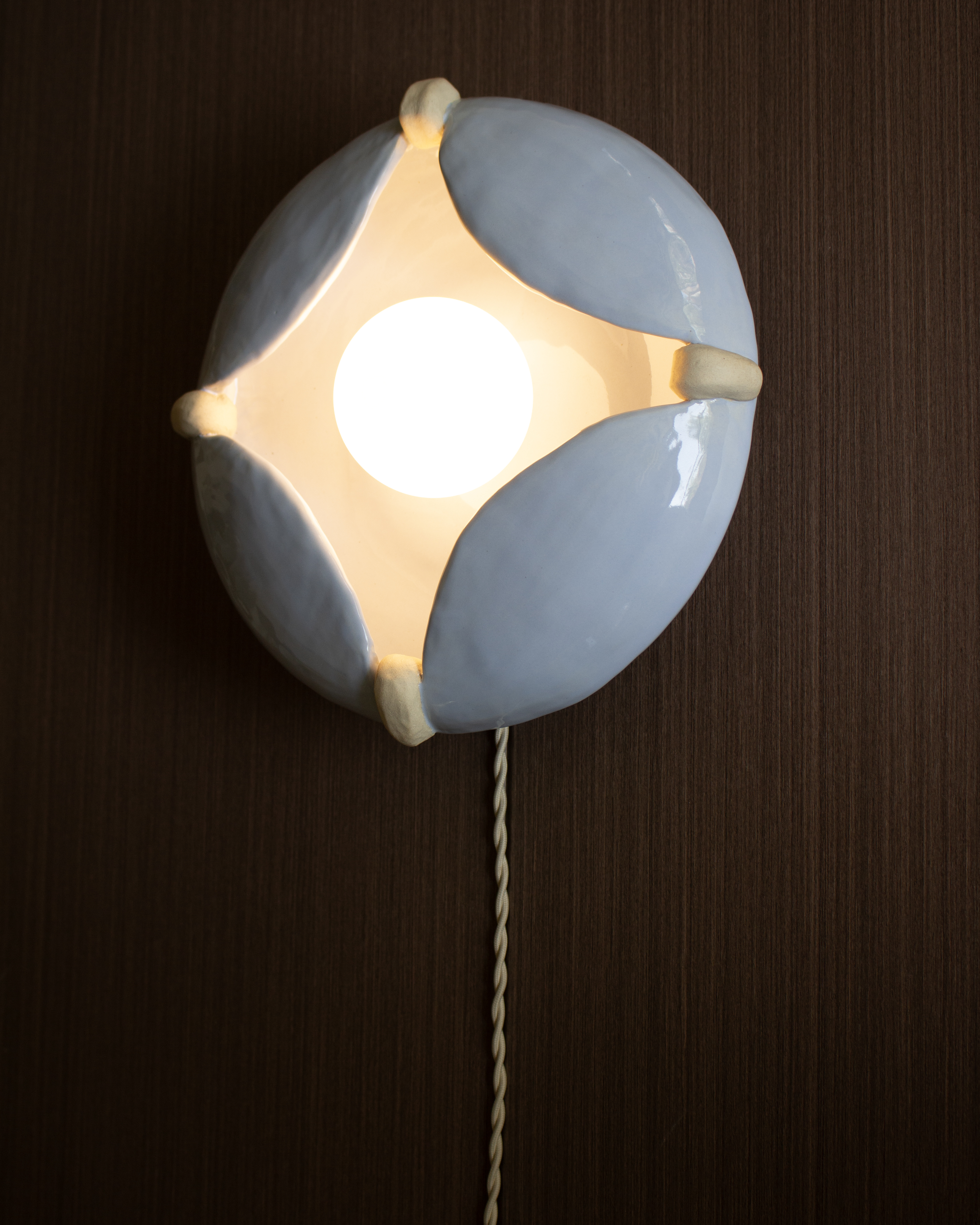 The form of this piece has contrast between the inner and outer shell. Whether the light is on or off, the surfaces interact with light in completely different ways, creating a dynamic relationship between light and shadow. Also, curve lines that connect between prongs suggest a form resisting openness, as if striving to protect the light or darkness within.